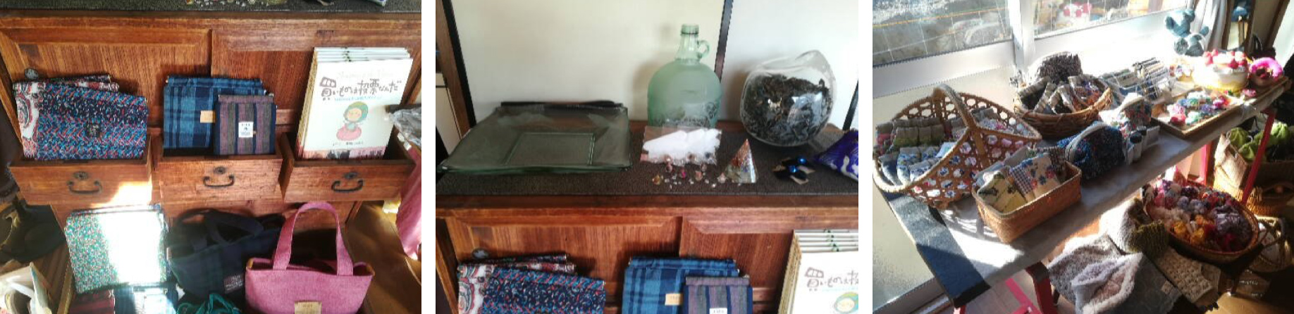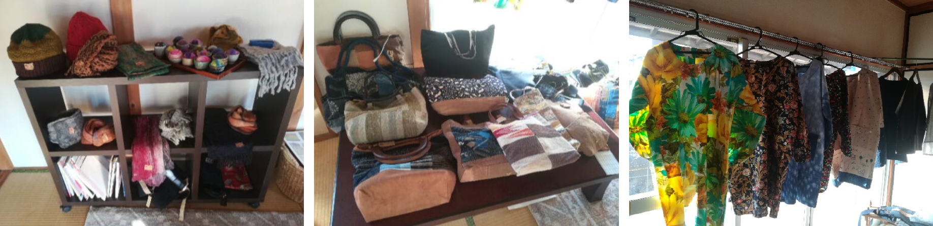 ら・ぱれっとで月2回開催しているミシンカフェの手作り品と手づくり大好きな人たちも参加してくれました。時間をかけて大事に作られたバックやポシェト、着やすさ機能性を考えて作られたカラフルなエプロン。フエルトマフラーや可愛い針刺しなど作品がいっぱい。